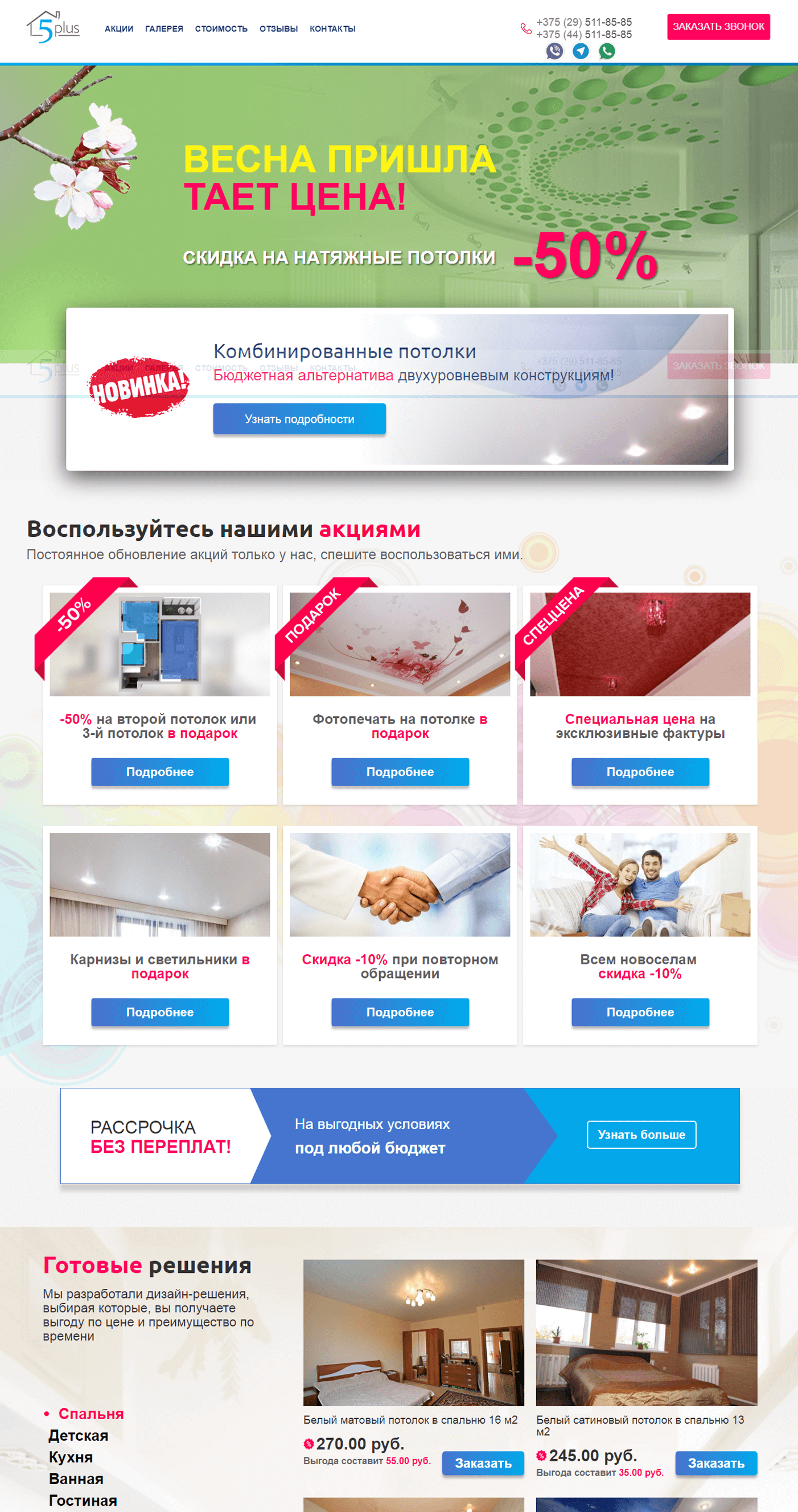 Разработка продающего Landing Page. Компания 5PLUS предлагает все виды натяжных потолков, а также возможность выбрать свой потолок online на сайте.